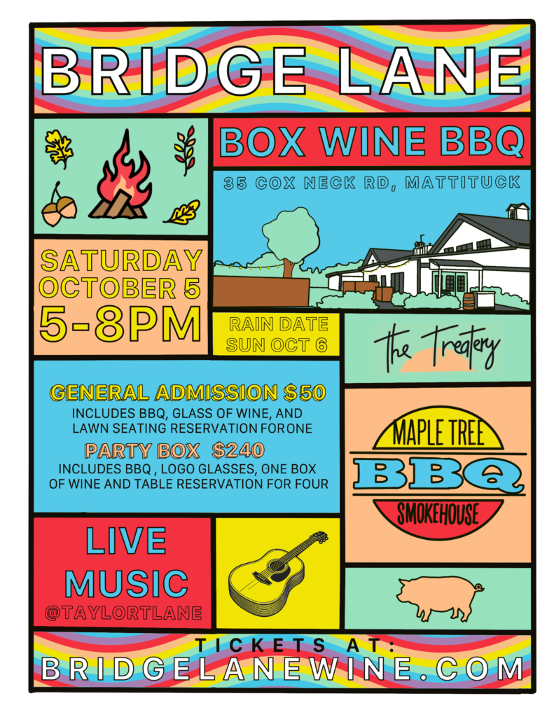 Individual Ticket $50 – Includes one can of Bridge Lane wine, one BBQ plate, admission to event (seating is first-come, first served lawn area)