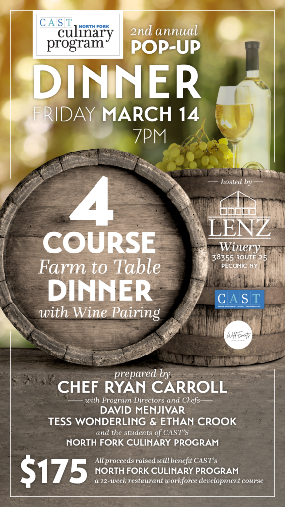All proceeds raised will benefit CAST’s North Fork Culinary Program, a 12-week restaurant/hospitality workforce development course currently in its 6th year. This annual program provides essential job readiness and skills needed to work in a professional kitchen and restaurant for both adult and youth participants.