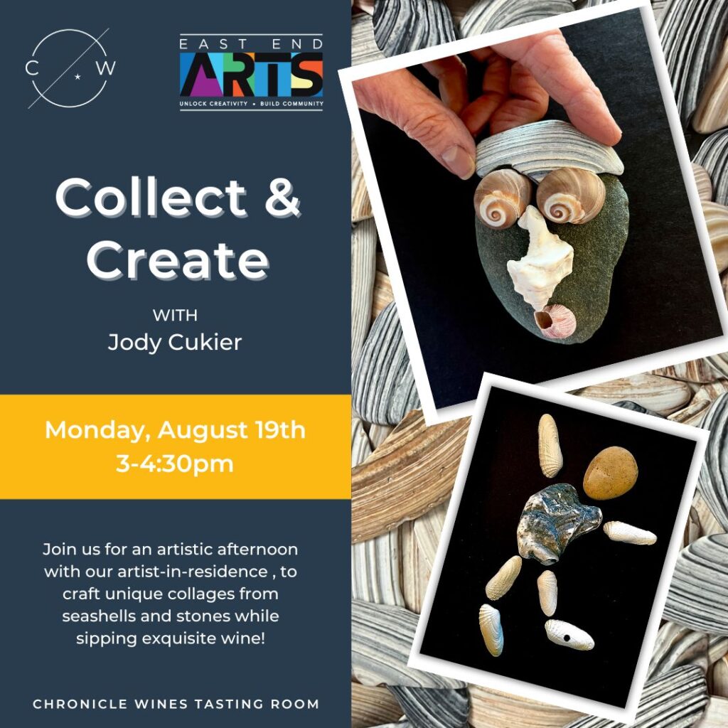 Using seashells and stones gathered from local beaches and beyond, create a collage that creatively combines found fragments…and friends. Participants are welcome to bring their own special specimens, but plenty will be provided. Create a unique piece of art, all while enjoying a glass of Chronicle Wine! No experience necessary. Just imagination!