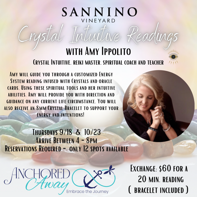 Amy will guide you through a customized energy system reading infused with crystals and oracle cards.
