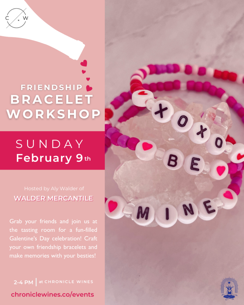 Gather your favorite gals (or guys) and celebrate the season of love and friendship with a creative twist! Join us for a special Galentine’s Day bracelet making workshop at Chronicle Wines led by Aly Walder of Walder Mercantile on Sunday, February 9th, from 2pm-4pm!