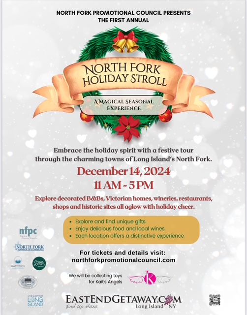 The North Fork Holiday Stroll is a festive celebration of the holiday season, taking place on Saturday, December 14th, from 11 AM to 5 PM, across the picturesque towns of Long Island’s North Fork. This self-guided holiday adventure invites visitors to explore 4 beautifully decorated bed and breakfasts, local boutiques, restaurants, 3 Historical Council houses & sites, and wineries at your own pace.