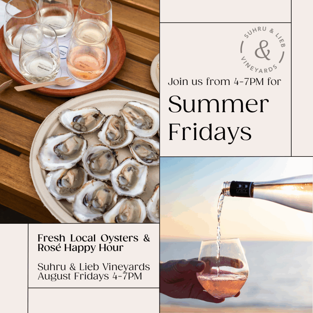 Join us Friday evenings from 4–7PM for Summer Fridays, featuring a rotating local food and wine special. Sip, snack, and soak in the sunset—because nothing says summer like fresh flavors and chilled wine.
