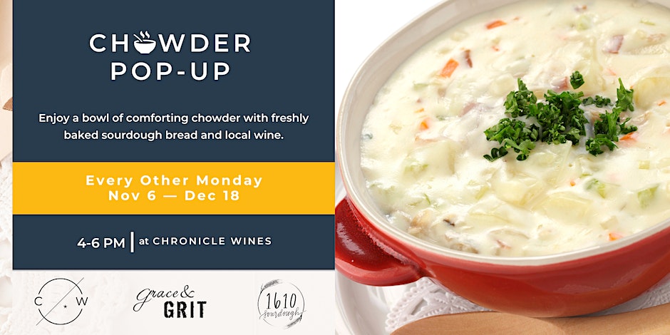 The Chowder Pop-Up is every other Monday in November and December at Chronicle Wines from 4-6 pm and coincides with our weekly happy hour! Enjoy a bowl of chowder by Grace & Grit and freshly baked sourdough bread by 1610 Sourdough and explore all tasting menu wines, which are 50% off by the glass a la carte. Plus, pre-order whole country sourdough loaves by1610 Sourdough and take them home with you!